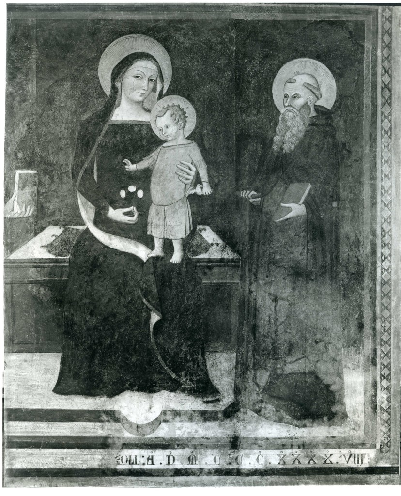 Frammento di affresco staccato, di 211 x 173 cm, raffigurante Madonna col Bambino e sant’Antonio abate. Inventario 698.