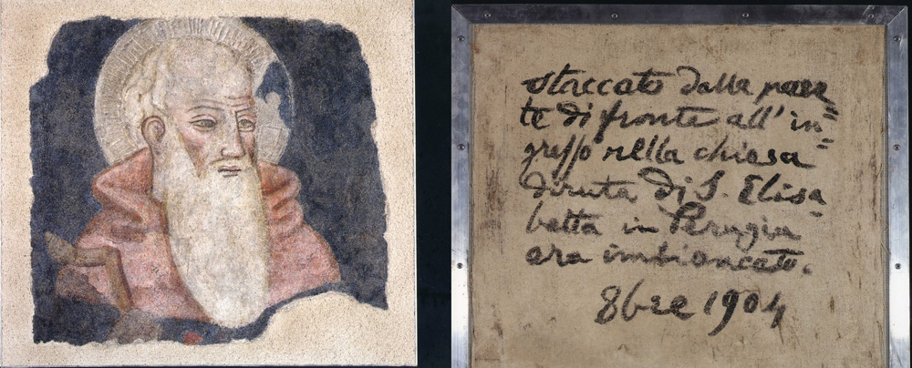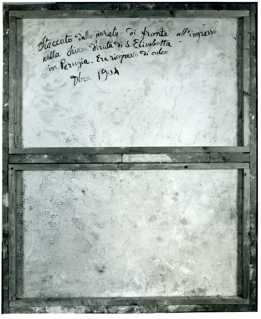Sul retro scritta: “staccato dalla parete di fronte all’ingresso della chiesa di S. Elisabetta in Perugia, era imbiancato. 8Bre 1904”.