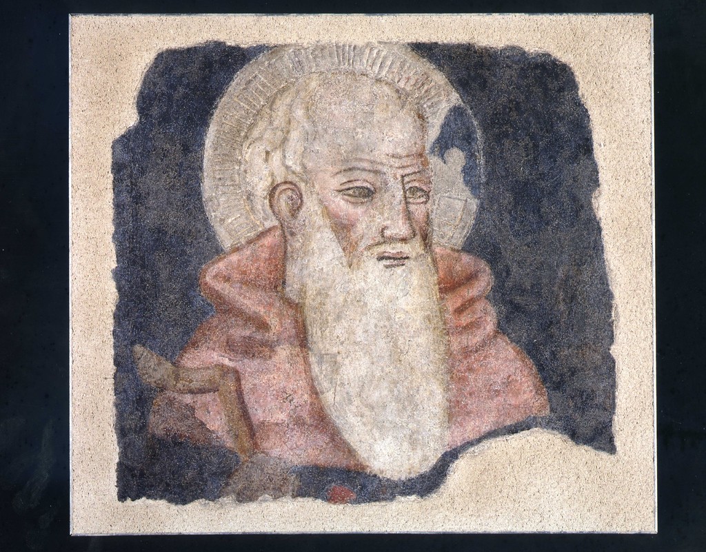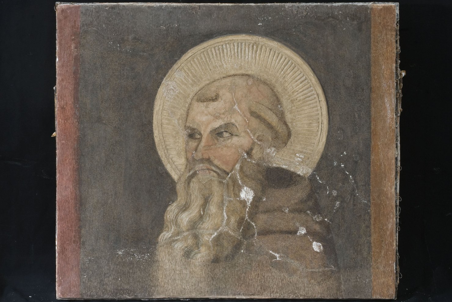 Affresco staccato e trasportato su massello di gesso, 37 x 40 cm, raffigurante il busto di s. Antonio abate, di ignoto di scuola umbra. Datato 1340-49.