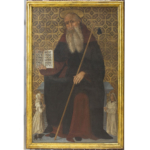 Sant’Antonio è a destra, di tre quarti, con barba bianca biforcata e saio; tiene nella mano destra un bastone a tau e nella sinistra un libro chiuso. Sul retro l’indicazione della provenienza.