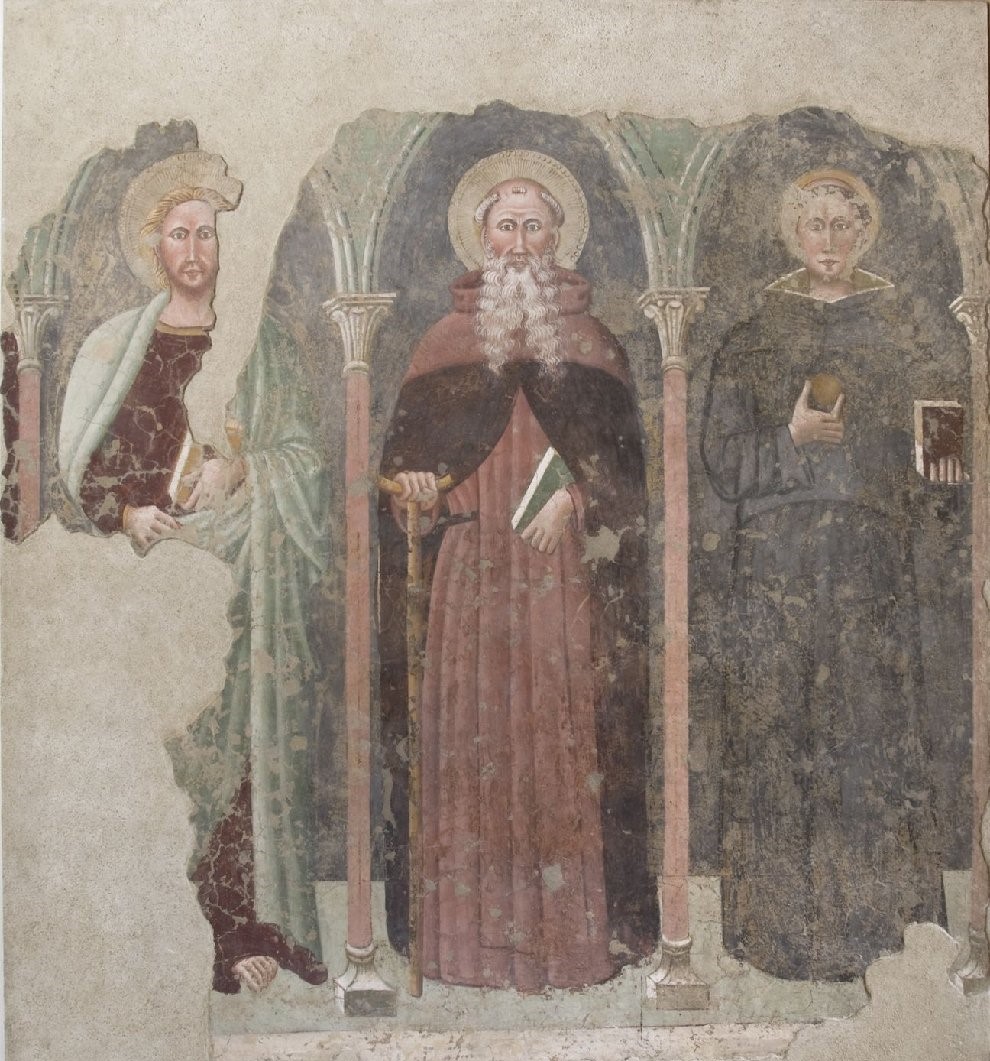 Frammento di 110 x167 cm che raffigura san Nicola da Tolentino, s. Antonio abate e santo Apostolo, inventario 705. Attribuito al cosiddetto Maestro Ironico (attivo a Perugia tra 1320-1350).