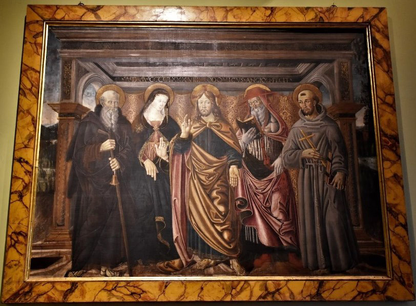 Dipinto a tempera su tela di 228 x 182 cm, raffigurante: “Cristo Redentore benedicente tra sant’Antonio abate, la Madonna, san Girolamo e san Francesco d’Assisi”.