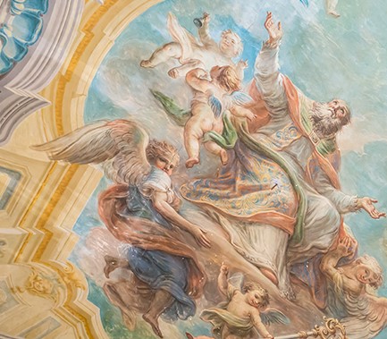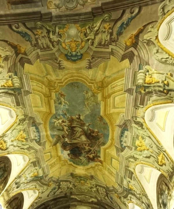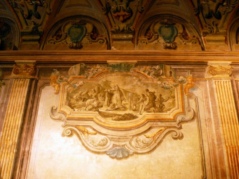 Le 8 lunette della volta ornate da volute, ricci floreali e vegetali con frutta che, in modo alternato, decorano finti paramenti architettonici con scudi e vasi rocaille su pseudo basamenti con teste di angeli. Tali decorazioni, come le quadrature delle pareti laterali, i riquadri e le varie decorazioni d’arredo, sono opera del pittore perugino Nicola Giuli (1722-1780).