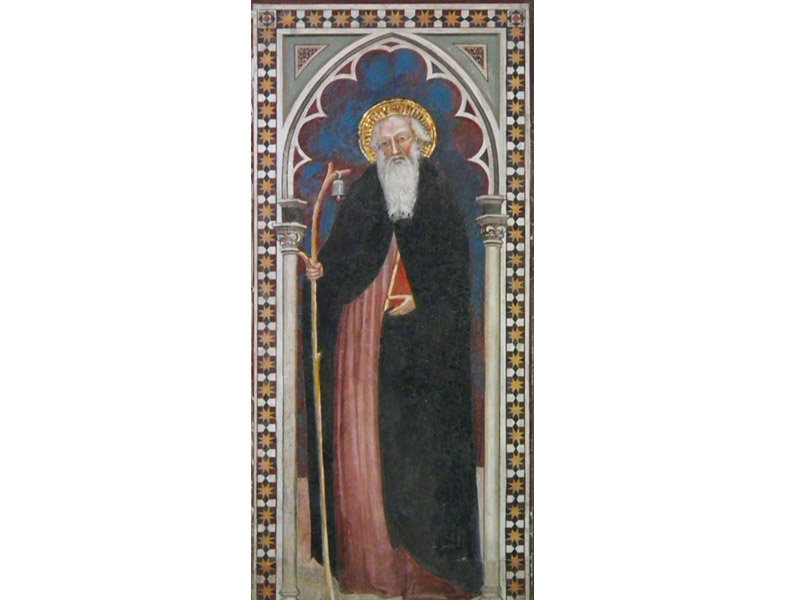 Sui pilastri esterni si trovano le figure dei santi Benedetto a sinistra e Antonio abate, a destra, realizzati durante i restauri neogotici; anche le vetrate sono degli anni trenta del Novecento. Sant’Antonio è raffigurato in forma tradizionale: barba bianca, saio rosso, mantello nero, libro rosso nella mano sinistra e nella destra un bastone con appesa una campanella.