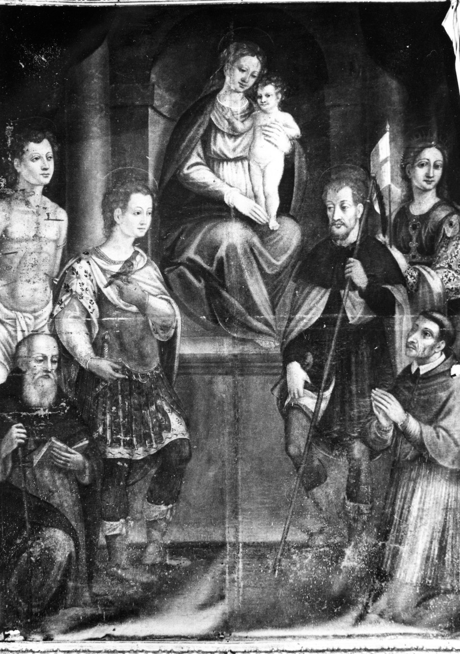 «Dipinto raffigurante la Vergine seduta nella nicchia di un altare che tiene tra le braccia il Bambino benedicente. Sulla destra Sant’Ansano col falcone, San Sebastiano e Sant’Antonio abate. Sulla sinistra San Rocco in abito da pellegrino, Santa Reparata con corona e bandiera crociata, San Carlo Borromeo inginocchiato. La tela riprende schemi del tardo Cinquecento e sembra collocabile intorno alla prima metà del XVII secolo come attesta peraltro la presenza di San Carlo Borromeo canonizzato nel 1610. Sembra opera di un pittore popolaresco operante ai margini della diocesi lucchese.»