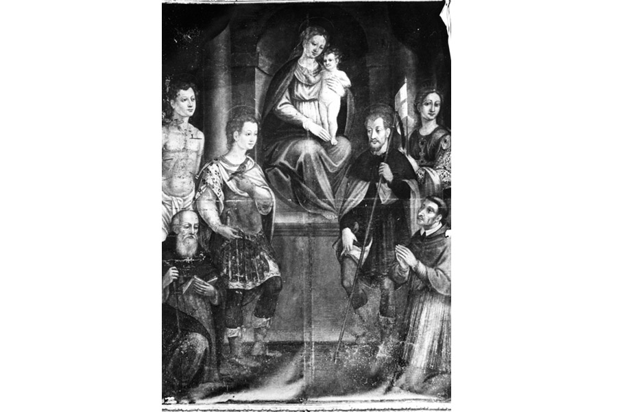 Olio su tela di 210 x 160 cm, raffigurante; “Madonna con Bambino, Sant’Ansano, San Sebastiano, Sant’Antonio abate, San Rocco, Santa Reparata e San Carlo Borromeo”