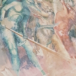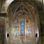 Sulla volta dell’abside, divisa in quattro vele, si vedono raffigurati i quattro Evangelisti mentre negli spazi dell’arco, sui pilastri e negli strombi della monofora si trovano variamente rappresentati Angeli e Santi.