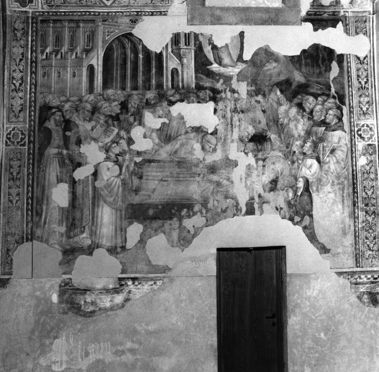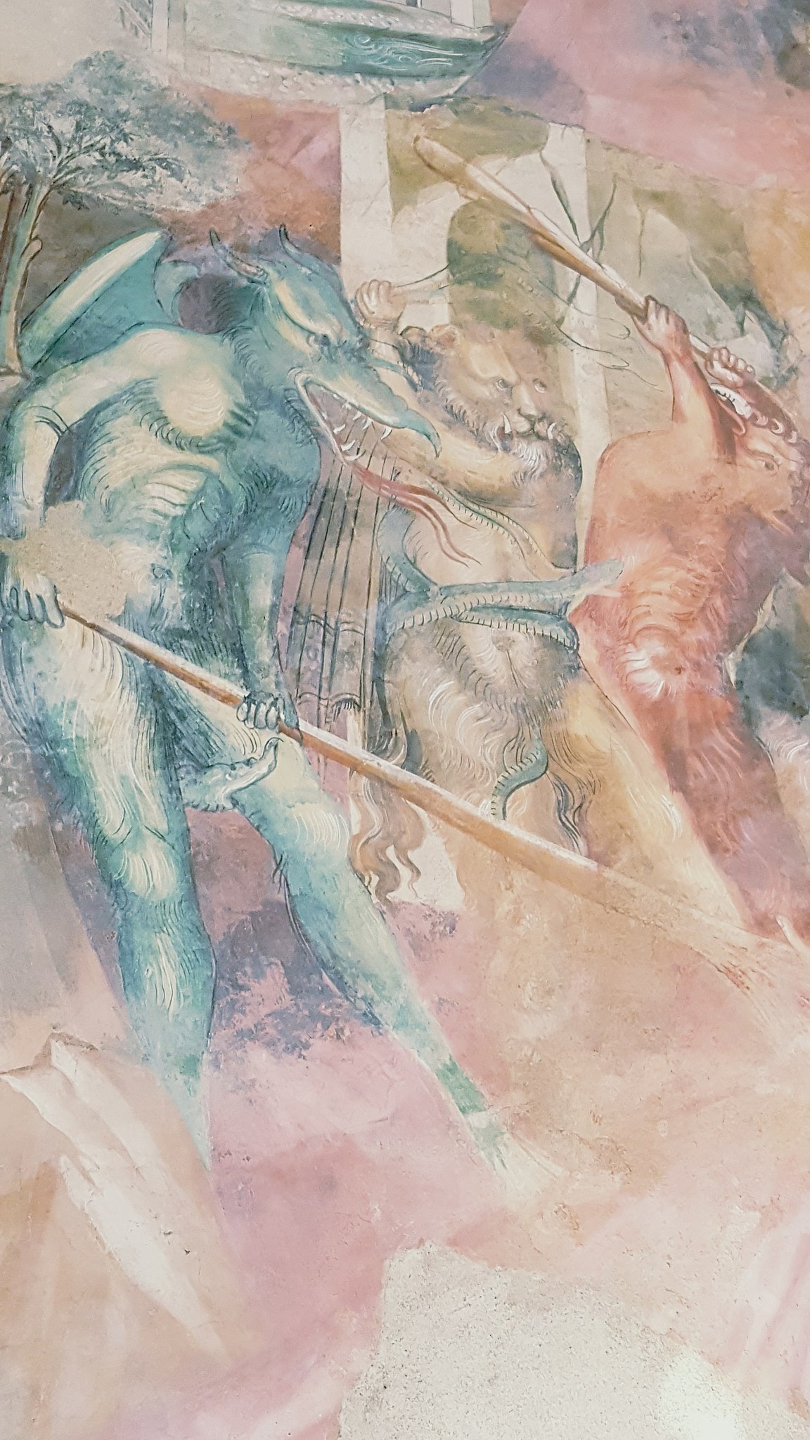 Sulla parete di sinistra del presbiterio, sant’Antonio tormentato dai diavoli; nella parete destra, la morte di sant’Antonio abate.