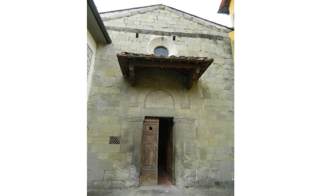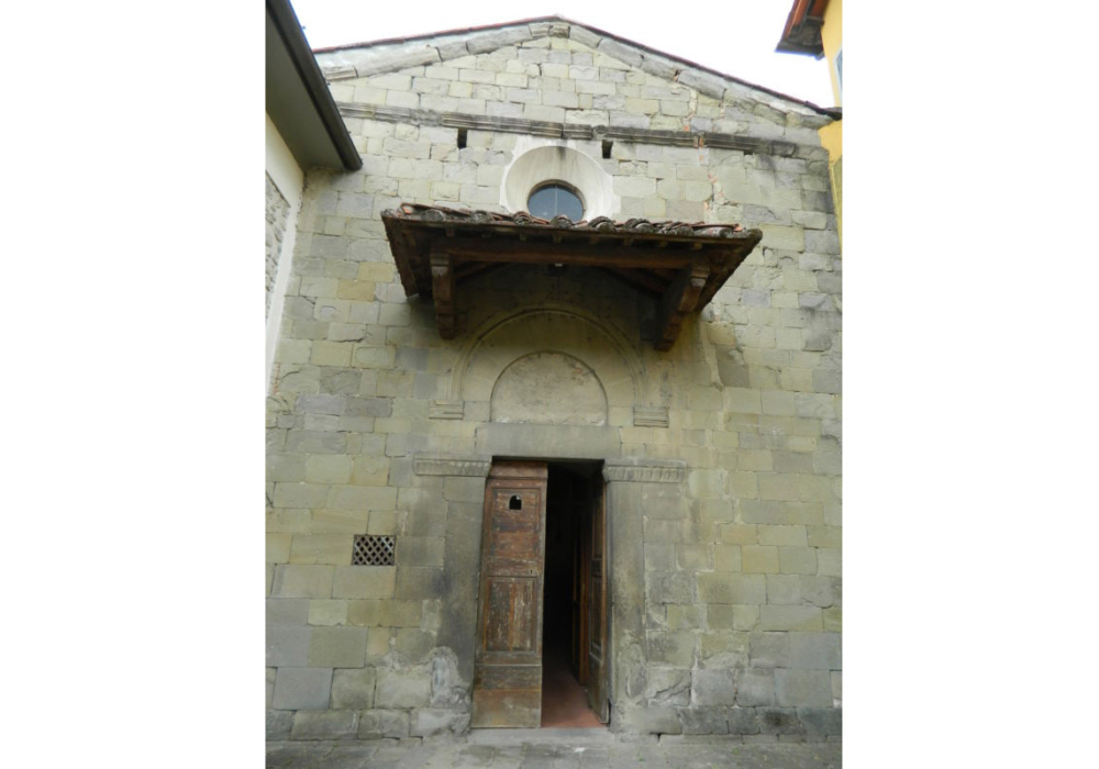 È caratterizzato da una facciata in pietra squadrata, semplice come il portale, la cui unica concessione al decoro è data dalla lunetta semicircolare, che però nasconde all’interno importanti opere d’arte.