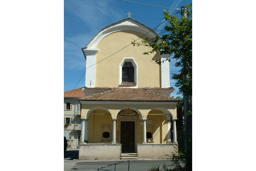 La chiesa è una costruzione semplice con linee essenziali, slanciata in altezza, ha un portico a volta con quattro colonne e capitelli di sarizzo, un bel portale, contornato in pietra, con ai lati due finestrelle ogivali protette da inferriata; altre cinque finestre sono una sulla facciata e le altre laterali.