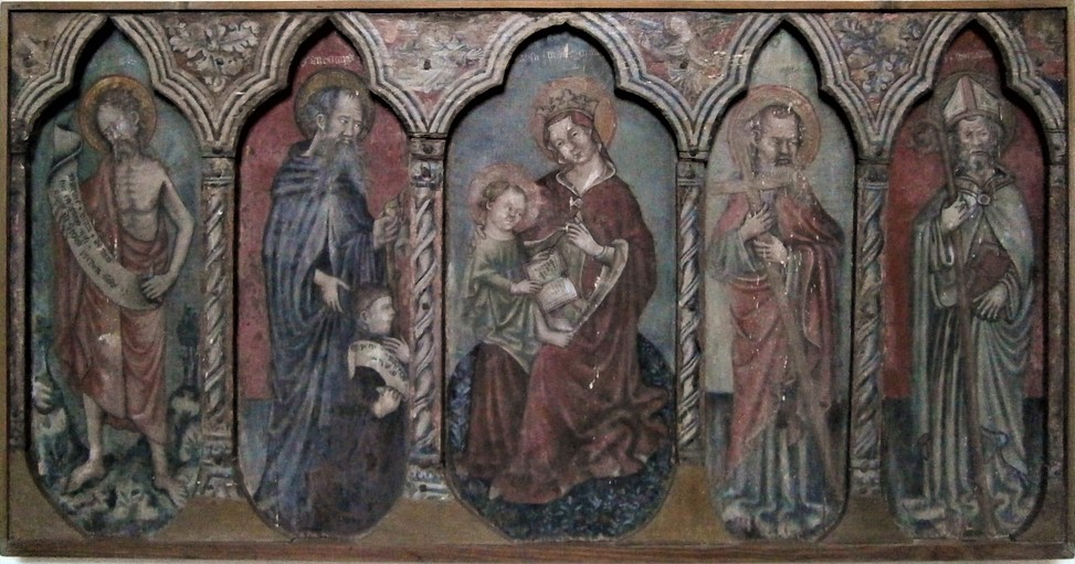 La tavola dipinta si articola in una teoria di edicole trilobe di inquadramento, ognuna delle quali include una figura; da sinistra: san Giovanni Battista scarmigliato e consunto dalle penitenze, sant’Antonio abate con l’offerente inginocchiato ai suoi piedi che si avvinghia al bastone del taumaturgo nel simbolico atto di esplicitarne la particolare devozione, al centro la Madonna dell’Umiltà (cioè seduta su di un prato fiorito anziché sul consueto trono) effigiata mentre insegna a leggere al Bambino, sant’Andrea reggente la croce e san Gottardo con le insegne vescovili.