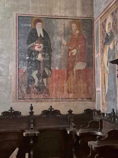 3) Affresco sulla parete della navata sinistra, sopra il confessionale, con cadute di colore; raffigura s. Antonio abate, databile al 1500-10, opera di ignoto artista di ambito lombardo. Il Santo tiene nella mano sinistra un libro e una campanella; il braccio regge un bastone.