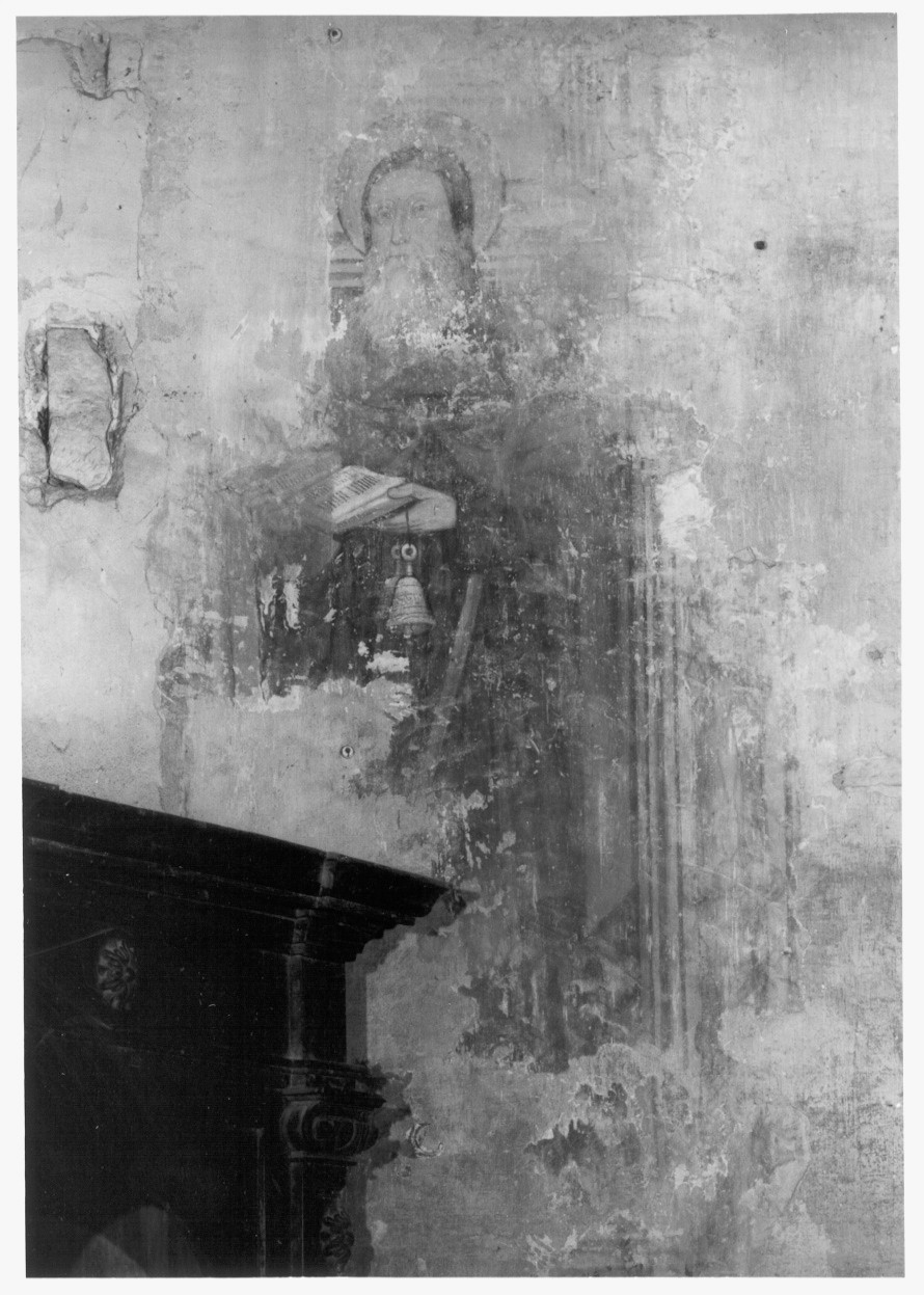 2) Affresco sul terzo pilastro della navata destra, raffigurante s. Antonio abate, opera di Manfredino Boxilio, circa 1496, misura 136 x 70 cm. In pessimo stato ,con ampie cadute di colore; il Santo ha una lunga barba bianca e indossa un saio; tiene in mano il bastone pastorale.