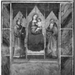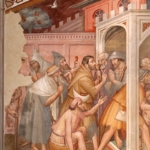 rovinata nella parte superiore, e Sant’Antonio battuto dai diavoli [II]; a destra dall’alto si vede il probabile Incontro col centauro [III] e l’Incontro tra sant’Antonio e san e San Paolo [IV]. Le quattro scene hanno una forma allungata con perimetro esagonale e gli angoli di risulta tra di esse sono decorati con un motivo geometrico, mentre in basso si conservano triangoli decorati più semplicemente per cui non si può escludere un ritocco in epoca successiva. Le due serie di storie risultano separate dallo scomparto centrale e terminano in alto con un tratto curvilineo. Questi caratteri e la conclusione ad arco ribassato dell’immagine centrale indicano chiaramente che in origine i due frammenti esterni decoravano l’imbotte di una nicchia sulla cui parete di fondo era dipinta la figura del Santo, ma è ignota la collocazione originaria. L’affresco fu staccato intorno al 1963.