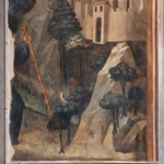 In basso a sinistra, della figura del Santo rimane solo il bastone e un paesaggio roccioso con una città sullo sfondo (iconografia poco spiegabile nel deserto, a meno che forse raffigurasse la città di Patras citata nella medievale “La leggenda di Patras”, vedi scheda.