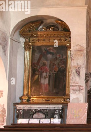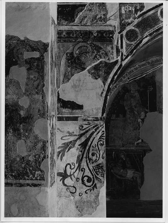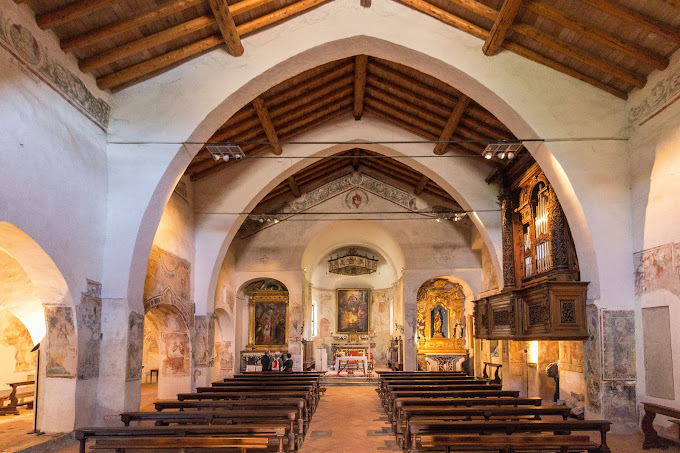 Il sottarco verso la prima cappella presenta un riquadro quattrocentesco con S. Antonio abate, quello verso la navata un S. Sebastiano ed un Santo Vescovo, datato 1514.