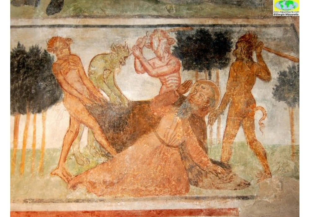 Sulla parete destra due riquadri rappresentano le tentazioni di sant’Antonio: in alto, il Santo tentato da un demone in forme femminili; nella scena in basso, sant’Antonio è percosso da quattro diavoli.