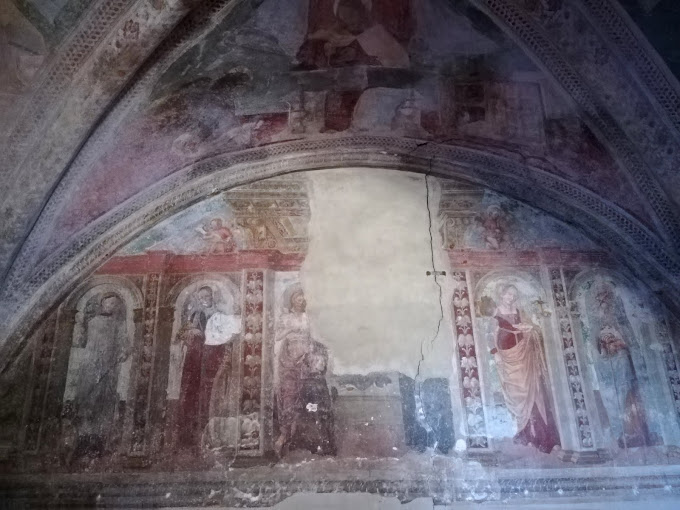 La prima campata, detta “cappella degli Apostoli”, fu affrescata da un artista sulla cui identità gli storici non sono concordi, tra la fine del XV e gli inizi del XVI secolo: nel sottarco i busti di dieci Apostoli; nelle vele gli Evangelisti.