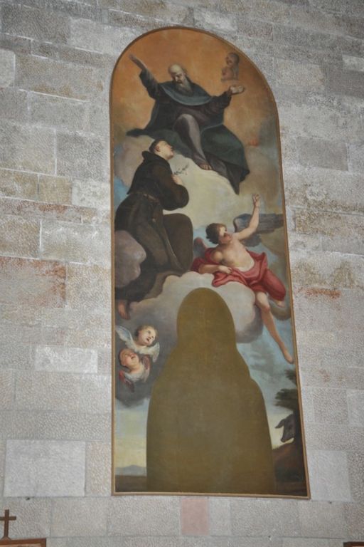 Sulla parete sinistra, una antica pala con l’immagine del Santo titolare in gloria.