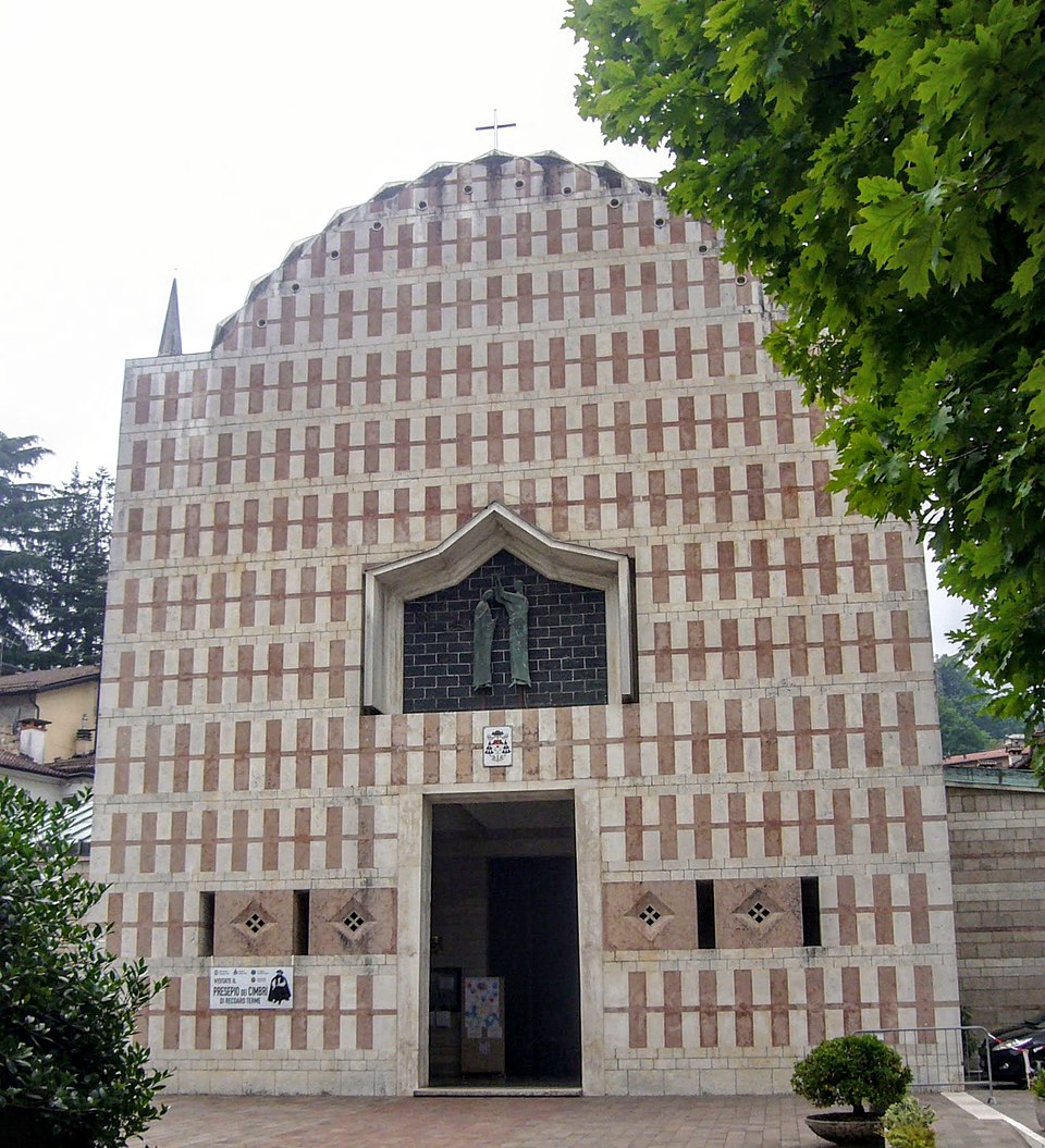 La facciata a capanna della chiesa, rivolta a sudest, è caratterizzata dalla bicromia ottenuta dall’alternanza di lastre rettangolari di marmo bianco e di marmo rosso e presenta al centro il portale maggiore sormontato da un’ampia nicchia contenente la raffigurazione dell’Incoronazione di Maria, opera di Marcello Mascherini del 1957.