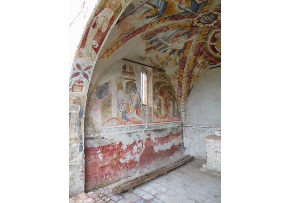 Il ciclo di affreschi del XV secolo occupa la volta con le sue quattro vele divise da grandi costoloni, la parete a est e l’intradosso dell’arco d’ingresso. Nella vela sud una mandorla contiene il Cristo Pantocratore attorniato da biondissimi angeli oranti vestiti di rosso e angeli musicanti vestiti di bianco; nelle due ad est e ovest compaiono rispettivamente san Giovanni Evangelista e san Giovanni Battista, sotto ciascuno dei quali sono rappresentati dieci Re d’Israele in due gruppi di cinque; i tre Arcangeli Michele, al centro, nell’atto di trafiggere il diavolo (le ali di Michele presentano l’occhio del pavone, motivo raro e raffinato), Raffaele e Gabriele, a destra con il giglio, occupano la vela sud.