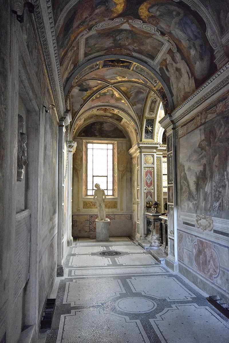 All’interno della Basilica, dopo la prima cappella di destra si entra in un breve corridoio – ornato dagli affreschi del belga Paul Brill (1554 – 1626) – che conduce ad una stanzetta identificata con “calidarium”, che secondo la tradizione è il locale termale dove Cecilia subì il martirio.