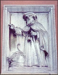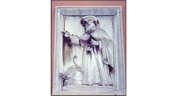 Il bassorilievo raffigura s. Antonio abate benedicente che tiene nella mano sinistra un bastone cui è appesa una campanella.