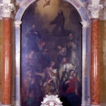 Sant’Antonio abate è raffigurato a destra in alto con saio bianco e mantello nero, tiene in mano bastone e campanella.