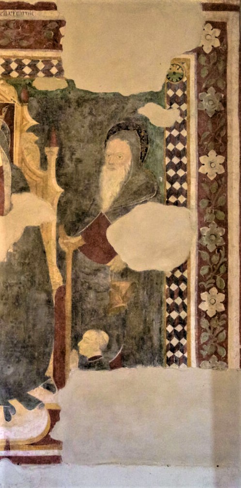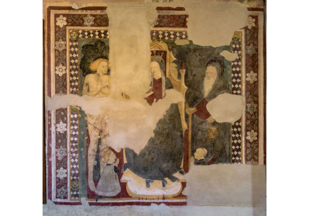 Sulla parete destra interna della cappella terminale della navata sinistra compare un affresco di più ampio respiro, purtroppo con ampie lacune: La Madonna con il Bambino tra i Santi Sebastiano e Antonio abate e committenti raffigurati più in basso, un chierico e due oranti con manto di ermellino. L’opera è datata 1452.