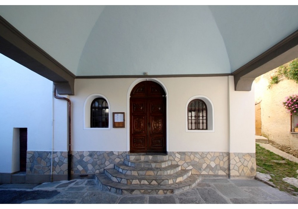La facciata principale è preceduta da un portico voltato che protegge i viandanti lungo la strada comunale; consta di una porta di ingresso con un bel portone in legno intagliato e due finestre arcuate ai lati.
