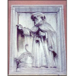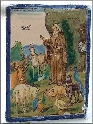 La formella raffigura sant’Antonio abate benedicente, che ha nella mano sinistra un bastone e cui è appesa una campanella, circondato da vari animali.