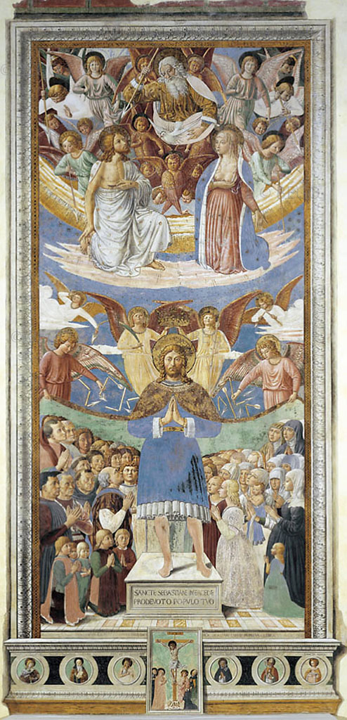 L’affresco votivo, di 550 x 250 cm, fu commissionato dagli Agostiniani come protezione contro la peste che nel 1464 colpì la città.