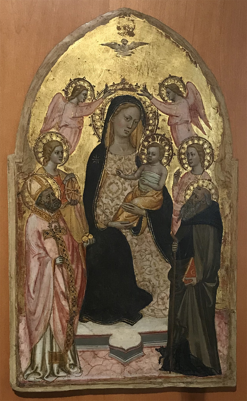 Dipinto a tempera e oro su tavola di 60 x 39,5 x 2,5 cm, raffigurante “Madonna col Bambino tra angeli, santa Caterina d’Alessandria, san Nicola da Bari, santa martire, sant’Antonio abate “, datato tra fine XIV – inizi XV secolo.