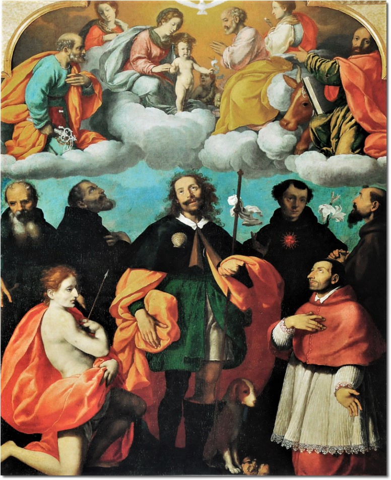 La tela rivela la maturità artistica del pittore. Organizzata su due registri, celeste e terrestre. Al centro campeggia il bel San Rocco con un bel panneggio albicocca, gli stanno accanto in simmetria San Sebastiano e San Carlo Borromeo dietro quattro frati: a sinistra Sant’Antonio abate con barba biforcata, bastone a T e campanella, Sant’Antonio di Padova (?), San Nicola da Tolentino con il sole rosso sul petto, San Francesco d’Assisi in preghiera.