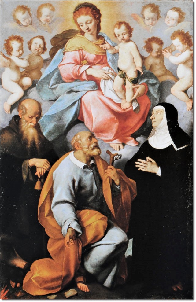 Nella composizione la Sacra Famiglia è evidenziata dai colori caldi e chiari degli abiti; San Giuseppe tiene in mano il bastone fiorito, suo attributo perché facendo germogliare la sua verga secca Dio lo indicò come prescelto per sposare Maria, lo sguardo è rivolto alla monaca assorta in preghiera. Alle spalle di San Giuseppe, a sinistra, è rappresentato Sant’Antonio abate con il campanello, il maiale e il fuoco; la luce che proviene da sinistra evidenzia i bei volti dei tre Santi.