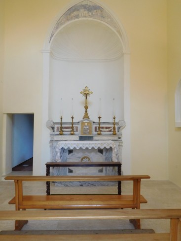 L’aula liturgica, a pianterreno, ha dimensioni 5 x 4,95 m e la sagrestia 3 x 4,95 m e ha le pareti semplicemente intonacate.