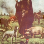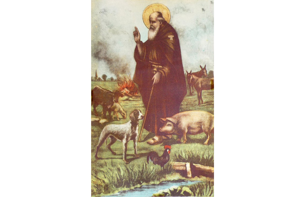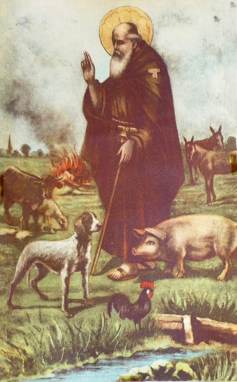 Stampa a colori rappresentante S. Antonio benedicente con un maiale, un cane e un gallo in primo piano; in secondo piano un toro, una pecora, un cavallo e un somaro. Il Santo è rappresentato con una lunga barba bianca, il saio monastico con la Tau e un bastone su cui è legato un campanello.