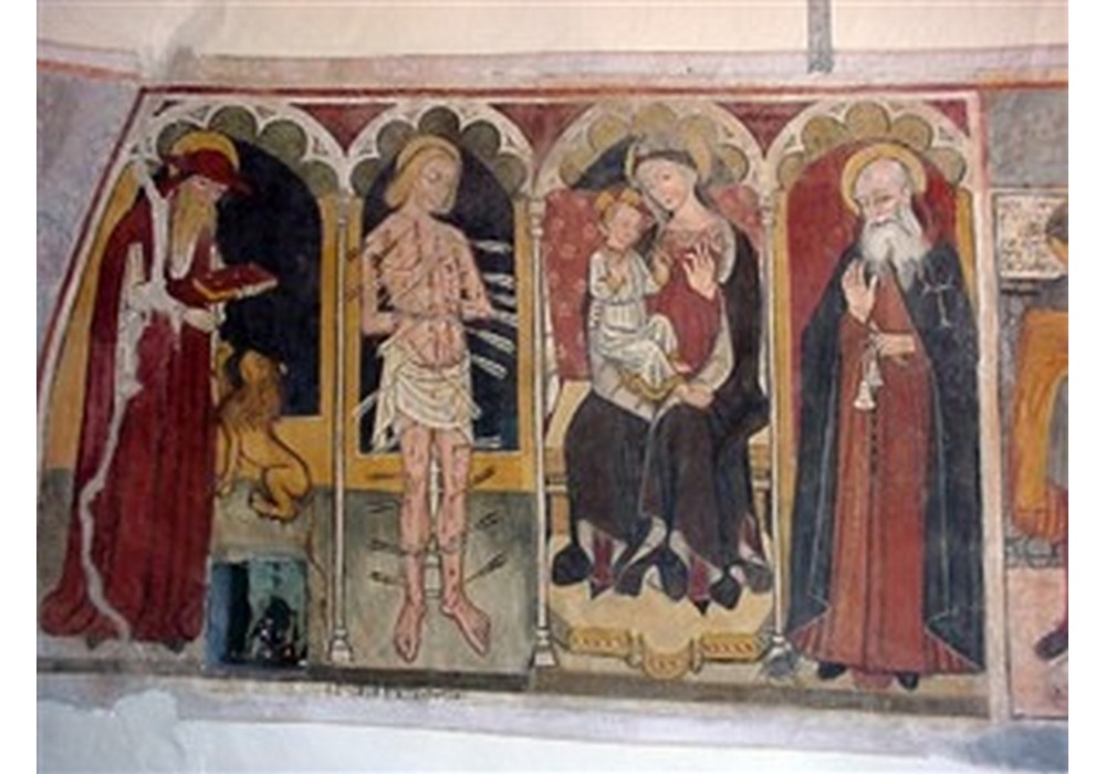 Sulla parete destra un polittico raffigurante san Gerolamo, san Sebastiano, la Madonna in trono col Bambino che stringe in mano un uccello e sant’Antonio abate, risalente al 1489 come risulta da un graffito del committente. I tratti richiamano le opere di Giovanni Mazzucco. Foto in alto.