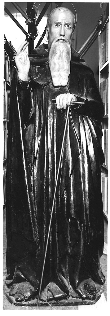 S. Antonio, con lunga barba e tau sul mantello, ha la mando destra nel gesto di benedizione e la sinistra poggia su un bastone a tau.