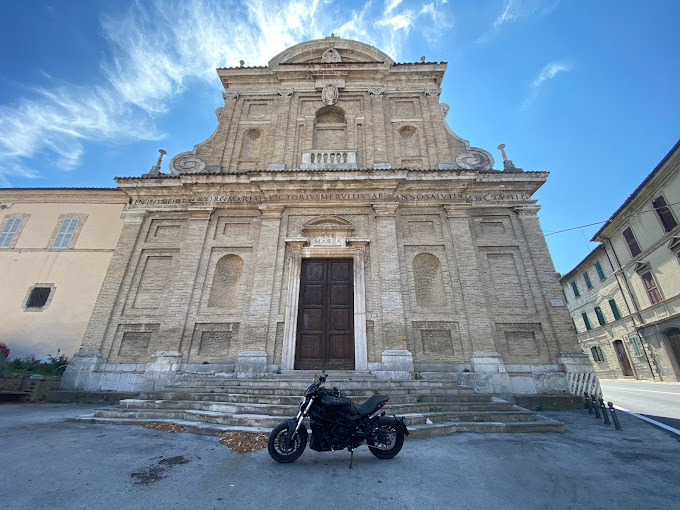 La chiesa, detta anche di Santa Maria del Ponte del Piano perché si trova nelle vicinanze del ponte che sovrasta il fiume Marena), fu edificata nel XIV secolo dai frati Agostiniani nelle dimensioni di una vasta cappella, subì continue modifiche negli anni successivi, fino ai primi del Seicento. Di questa originaria cappella rimane solo la parte absidale, che, infatti, differisce nello stile dal resto della costruzione. Nel 1492 fu costruita la sacrestia e circa un secolo dopo il campanile. La maestosa facciata, di stile barocco, fu fatta edificare nel 1618 da Vittorio Merolli. Annesso alla chiesa il convento, abitato dagli Agostiniani fino alla soppressione del 1810. Nel 1822 l’occuparono i Silvestrini.