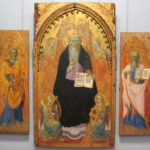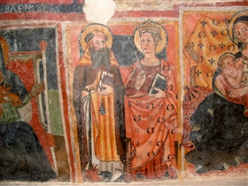 L’estremità sinistra del riquadro della Dormitio Virginis è coperta dal bordo di un pannello raffigurante San Tommaso e l’arcangelo Michele, attribuibile, per via della sovrapposizione e della sua peculiare resa formale, ad un intervento pittorico successivo. Le due figure, separate da una bordura rossa, sono accomunate dall’iscrizione votiva con il nome dei donatori: EGO MAINARDO CVM VXOR MEA OLIBA PING(ERE) FECI. Sopra la figura di San Tommaso, la cornice rossa del riquadro è coperta da un altro pannello con l’immagine di San Pietro e, sulla sinistra, i resti della figura di un santo con ricca tunica e clamide purpurea. È probabile che questo strato di intonaco sia stato dipinto a pochi anni di distanza da quello sottostante. Sulla base di vari confronti stilistici, si propende per una datazione di entrambi gli strati, alla seconda metà del XII secolo. Supera probabilmente la soglia del XIII secolo il riquadro con il profeta Esdra, Santa Margherita ed Onofrio, eseguito sulla parete opposta in posizione elevata.