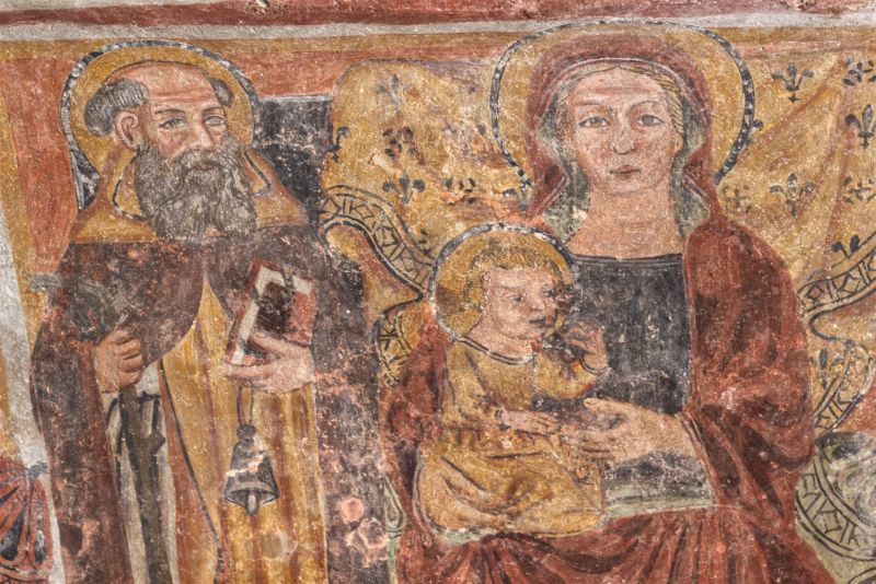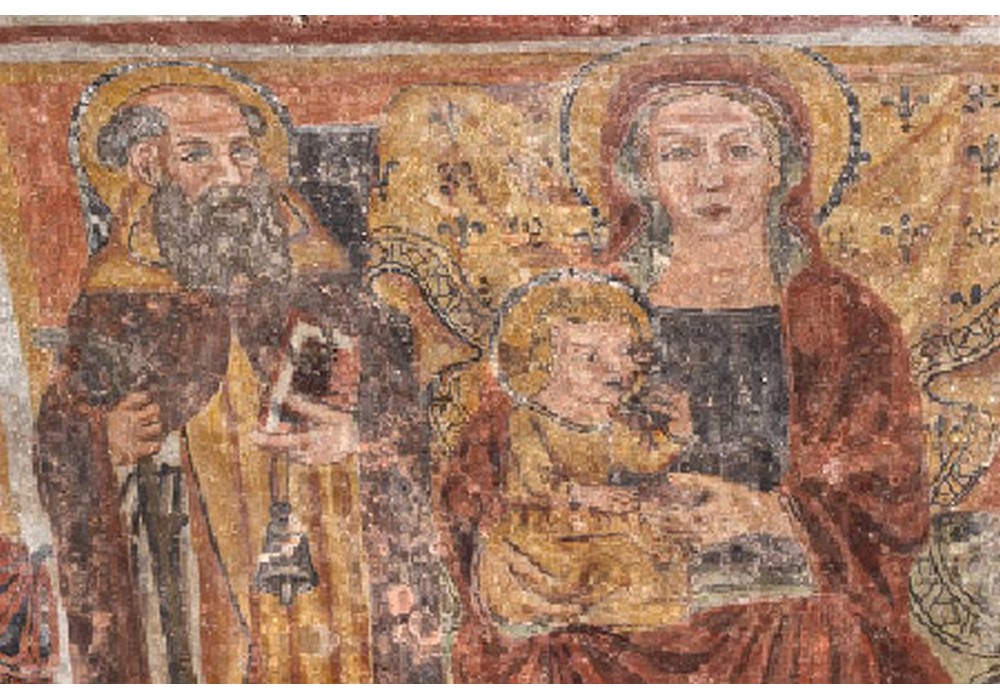 Chiaramente successiva risulta, invece, l’immagine della Vergine in trono con il Bambino posta all’estrema sinistra. Sulla zona inferiore sono presenti altri affreschi, per lo più ex voto aventi come tema predominante la Madonna con Bambino e tra i Santi.