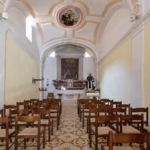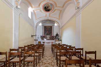 L’interno è a navata unica e coperto da una volta con elementi decorativi in stucco.