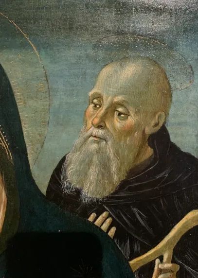 Antonio abate, padre del monachesimo, con espressione seria, brandisce la “tau”, una sorta di stampella a forma di “T” che non lascia quasi mai. La somma di tutto ciò è un’immagine affascinante, adatta a servire come supporto visivo per sostenere la preghiera del credente, e per soddisfare il piacere dell’esperienza estetica di tutti gli altri.