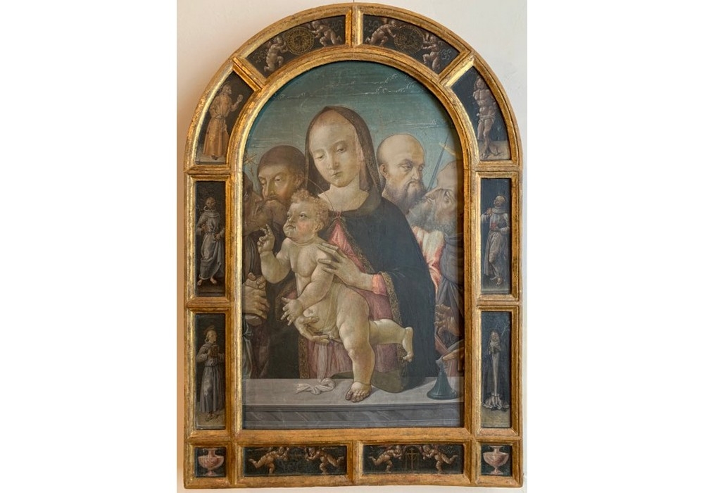 La cornice è suddivisa in dodici scomparti, anch’essi dipinti, che rappresentano figure di Santi e di putti.