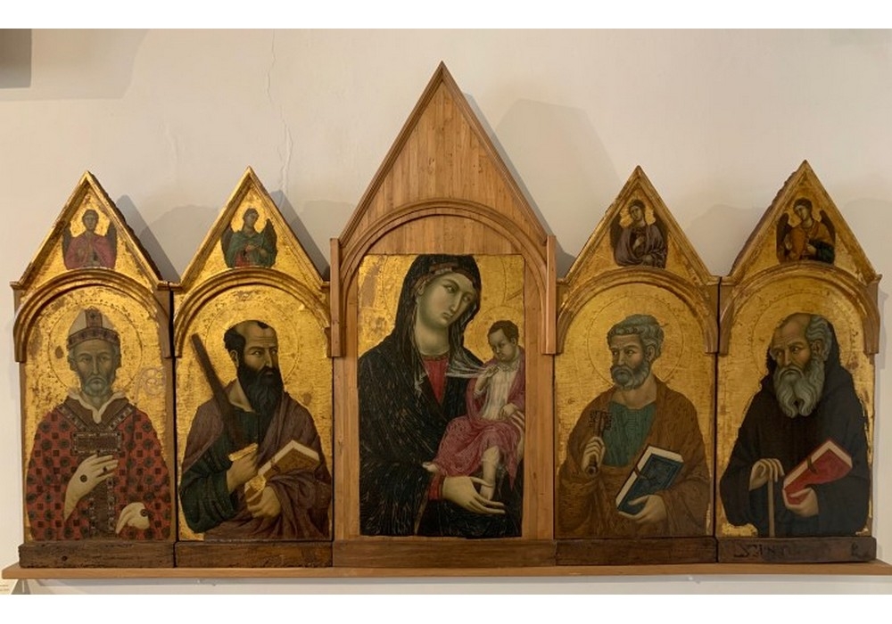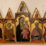 Opera di un ignoto pittore a cui è stato dato il nome di ‘Maestro di Città di Castello’, questa pala è stata esposta a lungo sulle pareti della Pinacoteca Nazionale senza il pannello centrale poi conservata a poche centinaia di metri, presso il Museo dell’Opera del Duomo. Fortunatamente, il tutto è stato ricostruito in modo che possa essere presentato oggi nella sua quasi totalità