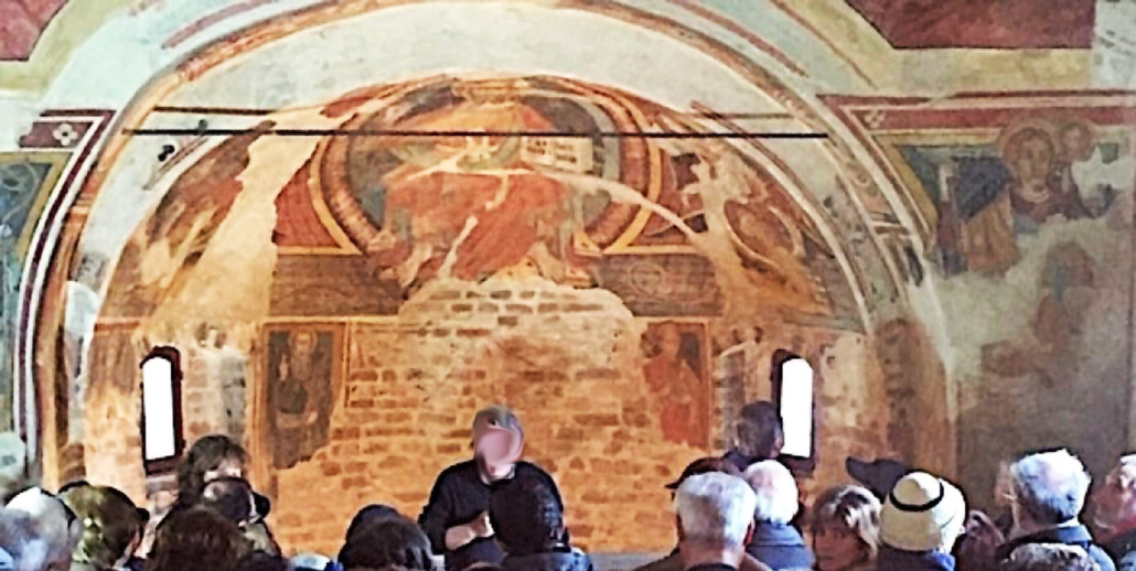 Nella parte inferiore dell’abside restano frammenti dipinti con figure di santi: sant’Eusebio in trono, sant’Antonio abate e san Lorenzo, mentre è andata perduta una Madonna in trono col Bambino, ancora visibile negli anni ’80 del Novecento tra la finestrella absidale di destra e san Fabiano. In una lacuna dopo la figura di sant’Antonio si intravedono tracce di un velario appartenente ad uno strato più antico.