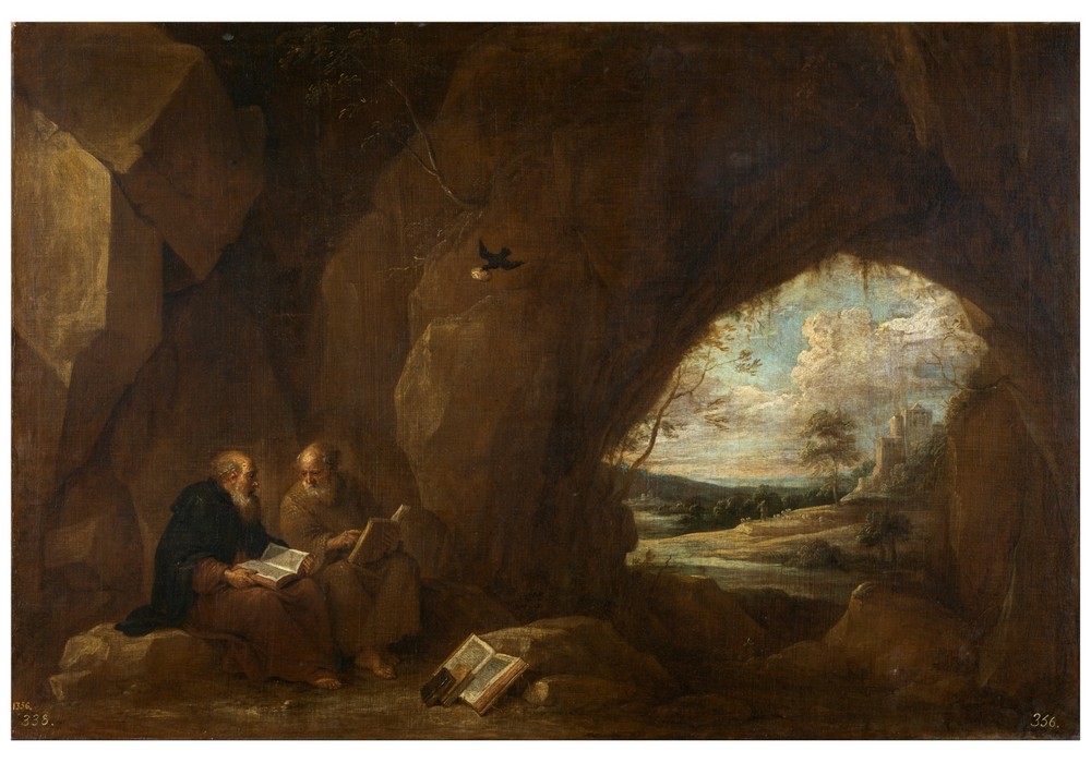 I due Santi sono raffigurati mentre sono intenti alla lettura all’interno di una grotta, come in altre opere di Tenier. In alto, il corvo sta portando un pane ai due eremiti.