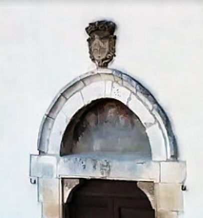 In alto, sull’arco, lo stemma dell’Ordine Costantiniano con l’iscrizione: SACELLUM S. CONSTANT. IMMEDIATE SUBIECTUM. La qualità degli intagli ed il carattere delle lettere dello stemma rimandano a un’epoca posteriore al 1425.