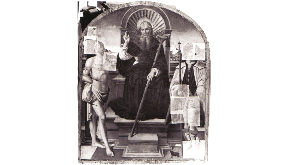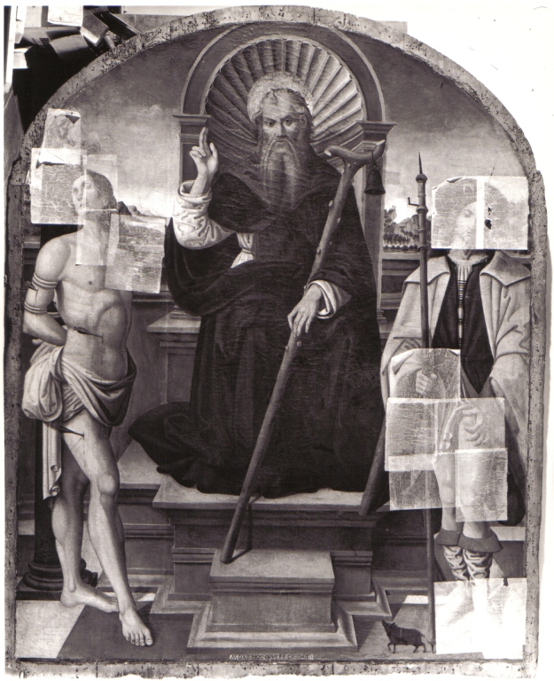 Tempera su tavola centinata di 231,5 x 188 cm. Raffigura: Sant’Antonio abate in trono tra San Sebastiano e San Rocco.